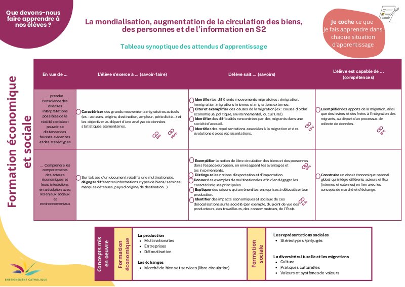 Tableau synoptique des attendus d'apprentissage FES en S2